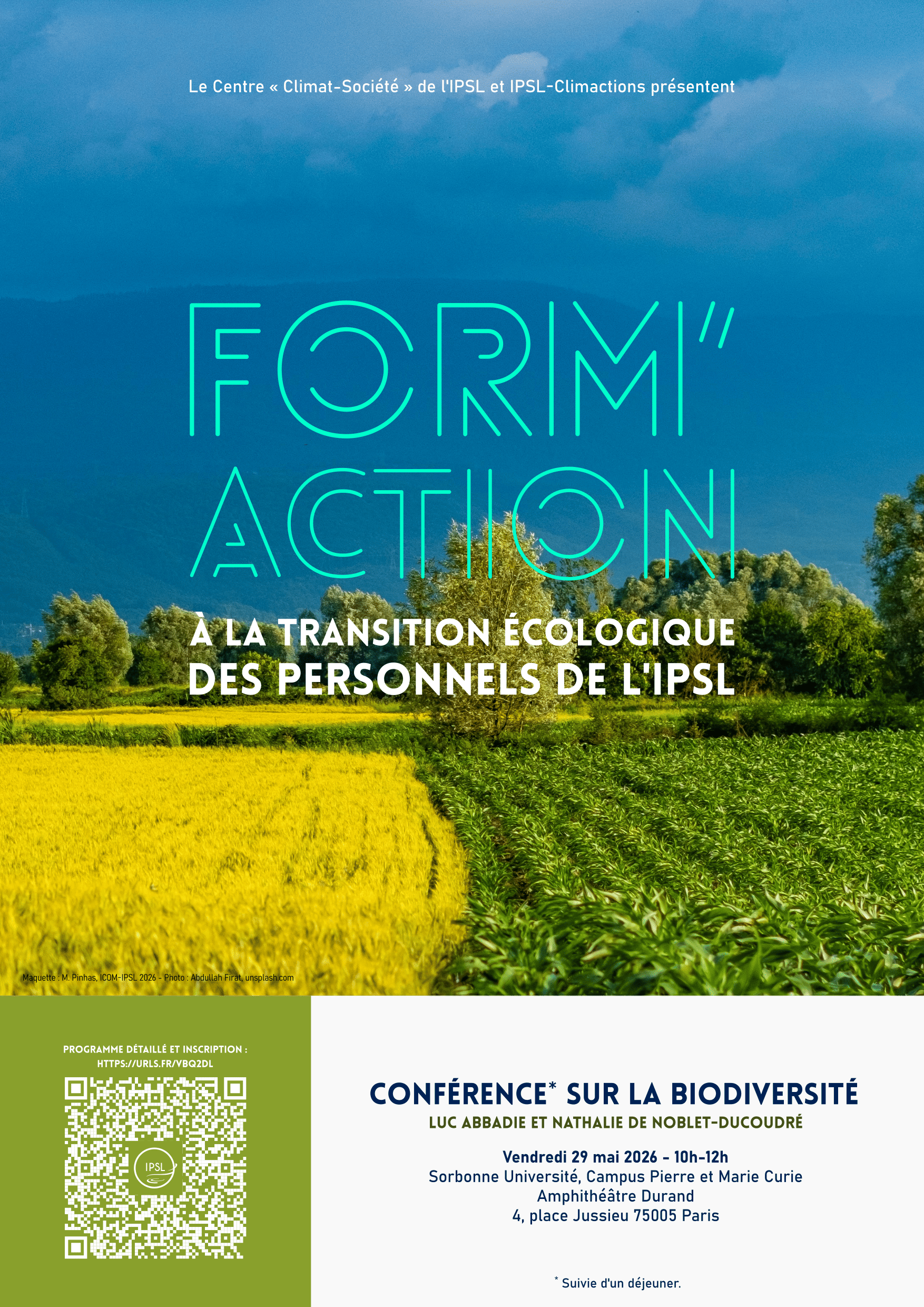 En complément de ce parcours en ligne, le Centre « Climat-Société » de l’IPSL et IPSL-Climactions vous invitent à la form’action à la transition écologique des personnels de l’IPSL : un cycle de trois conférences-débats animées par des scientifiques, pour approfondir votre connaissance des enjeux liés au changement climatique, à la biodiversité et aux ressources naturelles. A l'occasion de ces conférences, vous pourrez échanger directement avec des scientifiques issus des sciences naturelles et des sciences humaines et sociales, qui vous présenteront une vision systémique des changements environnementaux en cours et des solutions envisageables pour une transition écologique des sociétés, efficace et équitable.
